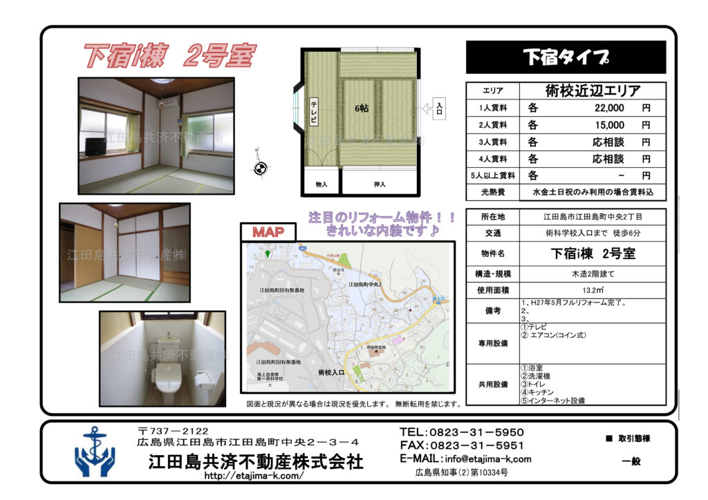 賃料:1人入居22,000円、2人入居15,000円、水曜週末使用の場合光熱費込、インターネット設備完備。
